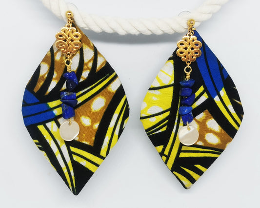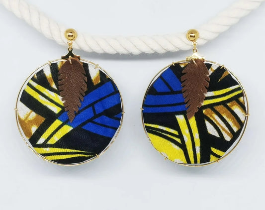 Boucles créole Wax & Leather plaqué Or -Bleu/Jaune